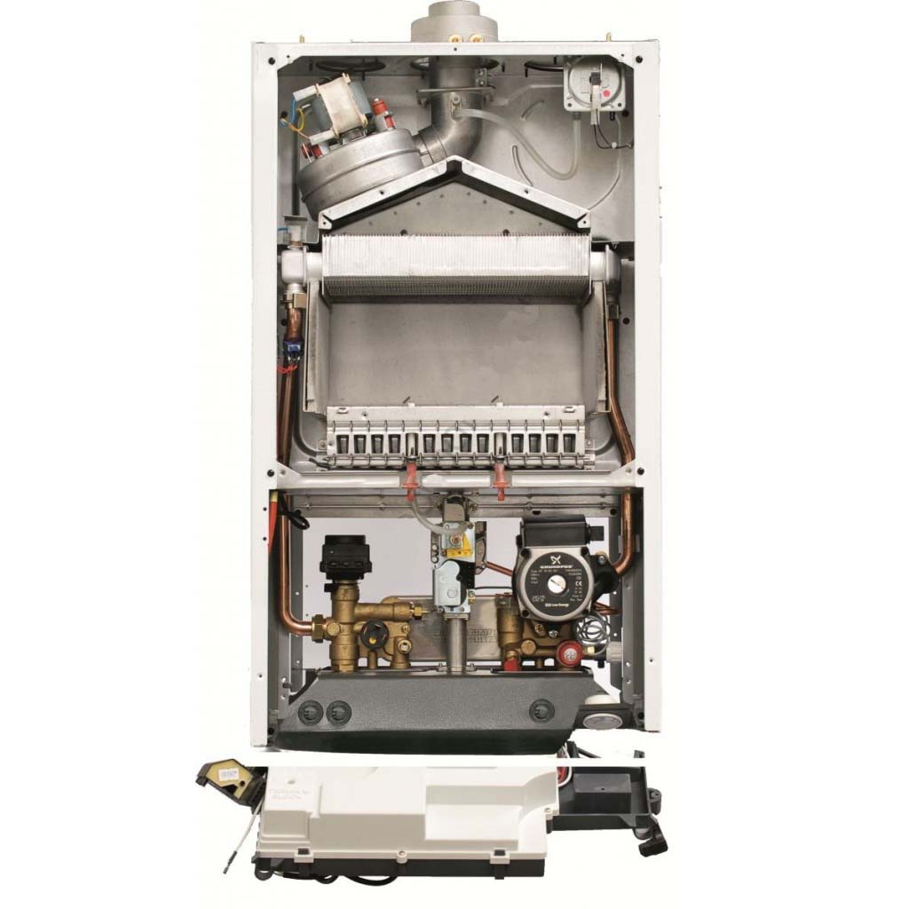 Модель оснащена раздельными теплообменниками: первичный — медный, для системы отопления, и вторичный — пластинчатый из нержавеющей стали, для ГВС. Камера сгорания — закрытая, с вентилятором для принудительного отвода дымовых газов.